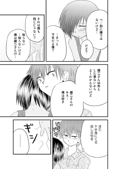 シャワー中の佳主馬にバスルームの外からソロプレイ(死)を強要する健二さんと、そんなのやらあと言いながら従順にしてしまう佳主馬の漫画です。